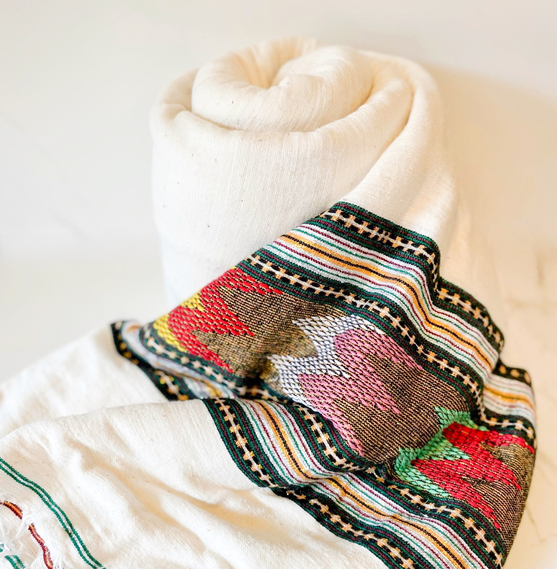 The Gabi is made of four layers of hand-woven cotton, fused together by one vertical seam down the center. This allows for easy draping across the body. While most people use the blanket as a household item, the Gabi is often worn by men outdoors in the City or in the Mountains of Ethiopia because of its ability to shield you from harsh weather. Historically, the Gabi has been used by men only, while women have worn the Netela, a two-layered shawl made of the same cotton.